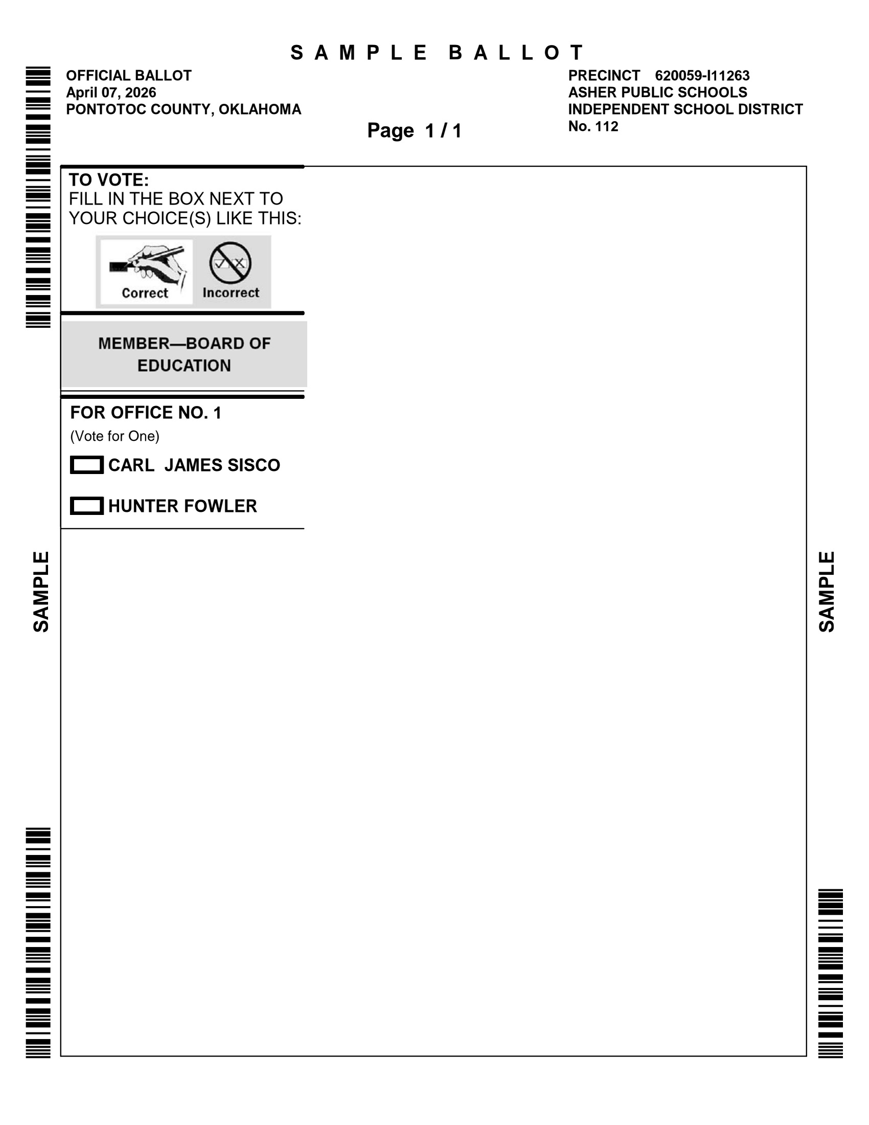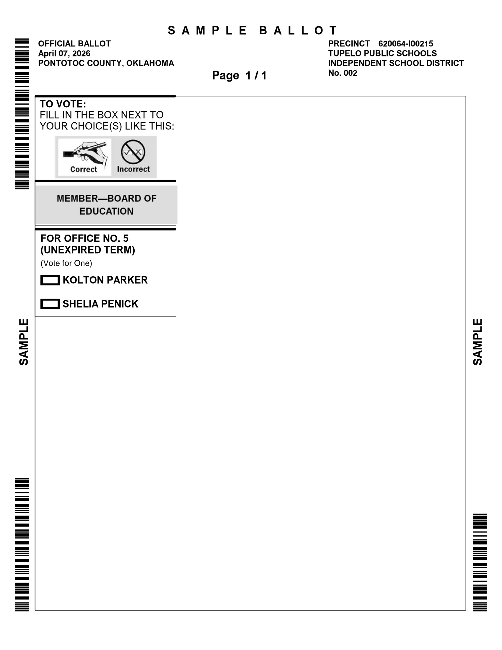 The Pontotoc County Election Board is responsible for maintaining voter registration records and for the conduct of all federal, state, county, municipal, school elections in Pontotoc County.