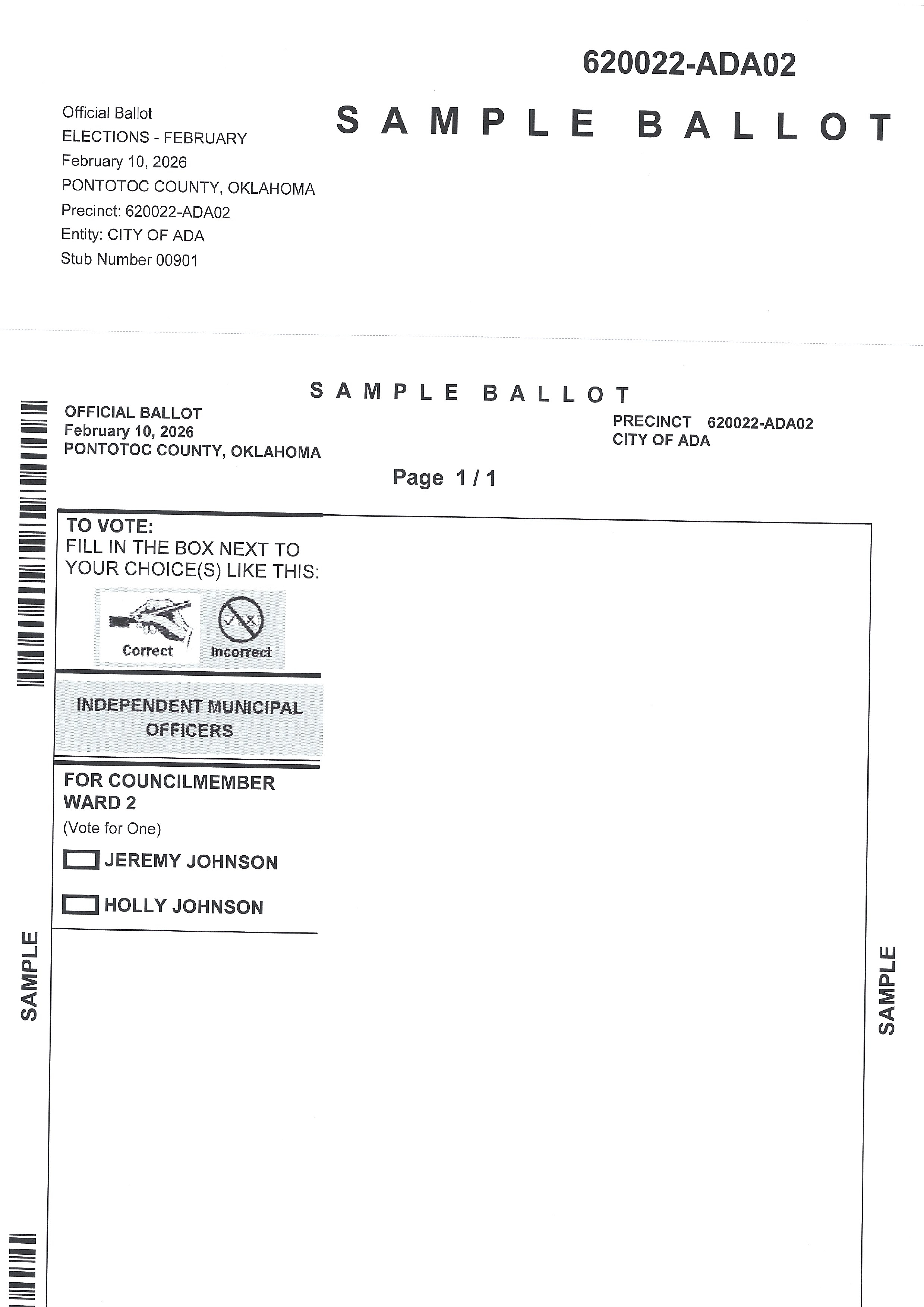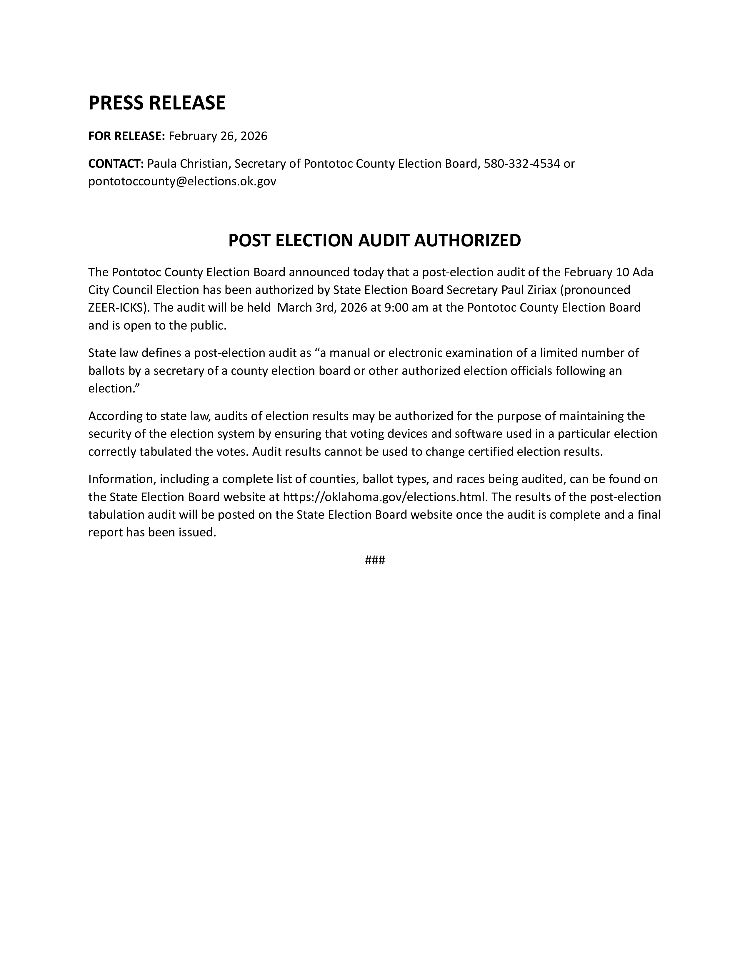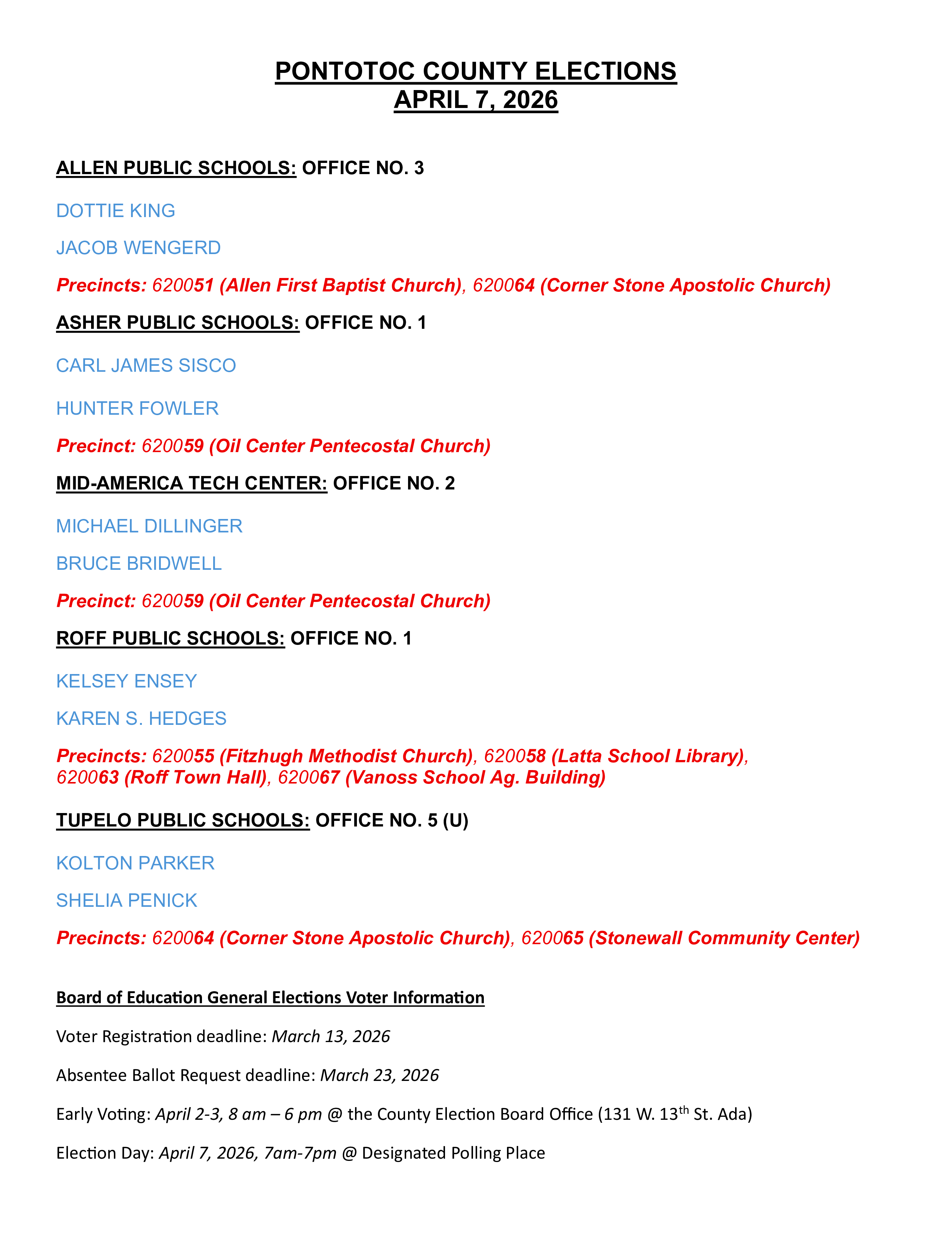 The next election for Pontotoc County will be April 7, 2026. Early voting is April 2-3, 8:00am-6:00pm at the County Election Board Office located at 131 W. 13th St. Ada, OK