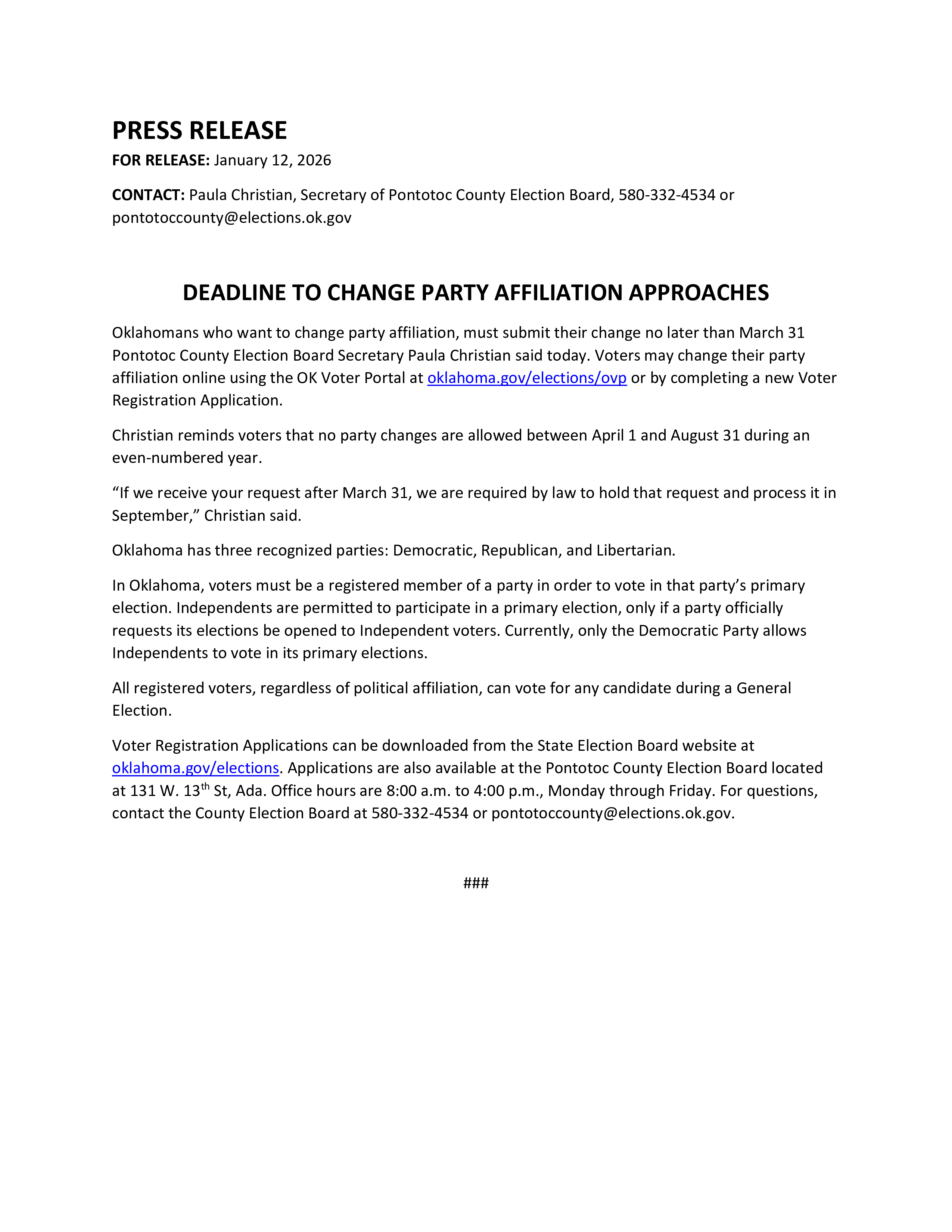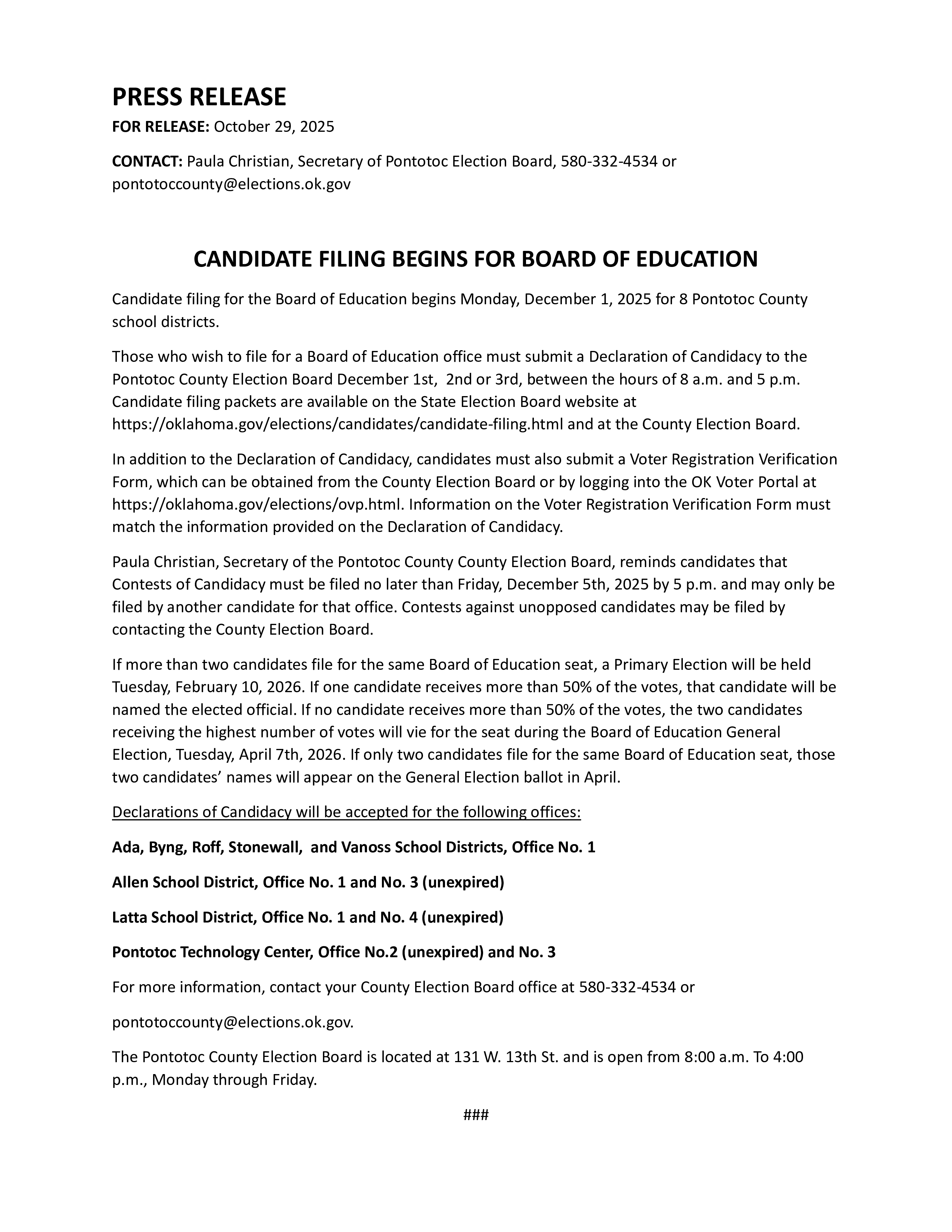 The Pontotoc County Election Board is responsible for maintaining voter registration records and for the conduct of all federal, state, county, municipal, school elections in Pontotoc County.
