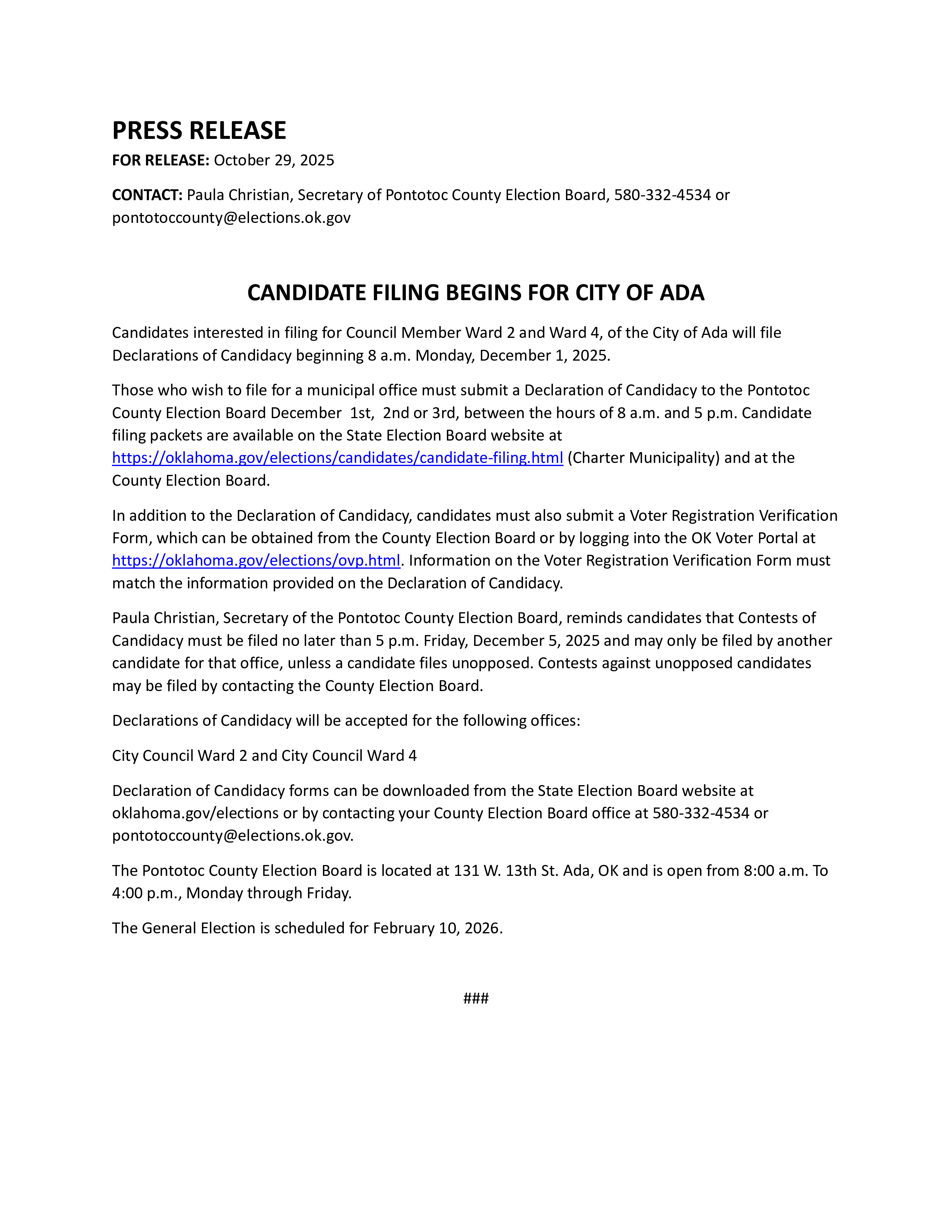 Candidate Filing: December 1 - 3, 2025 (8 a.m. - 5 p.m.)
